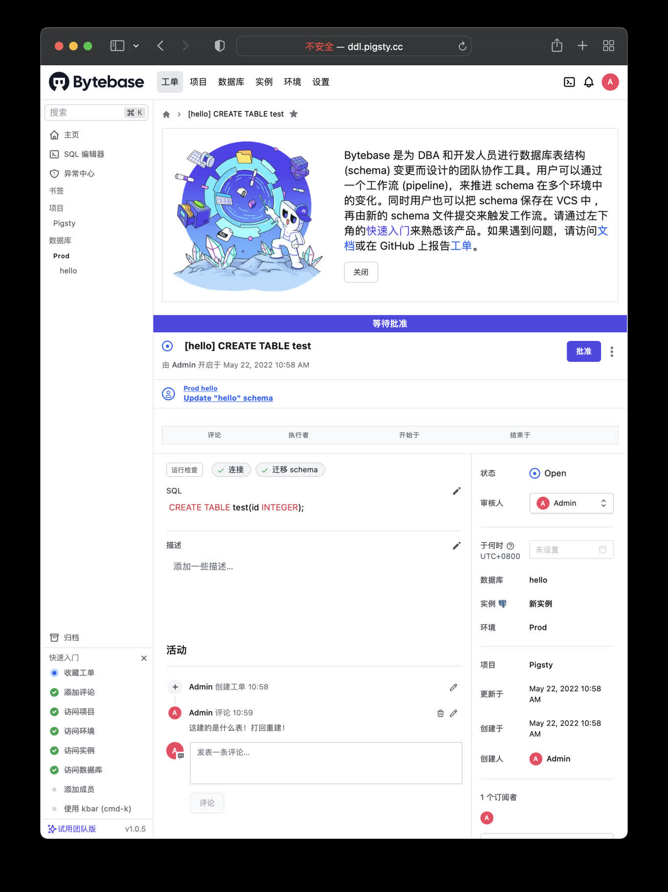 Then visit http://10.10.10.10:8887/ or http://ddl.pigsty to access bytebase console. You have to “Create Project”, “Env”, “Instance”, “Database” to perform schema migration.
