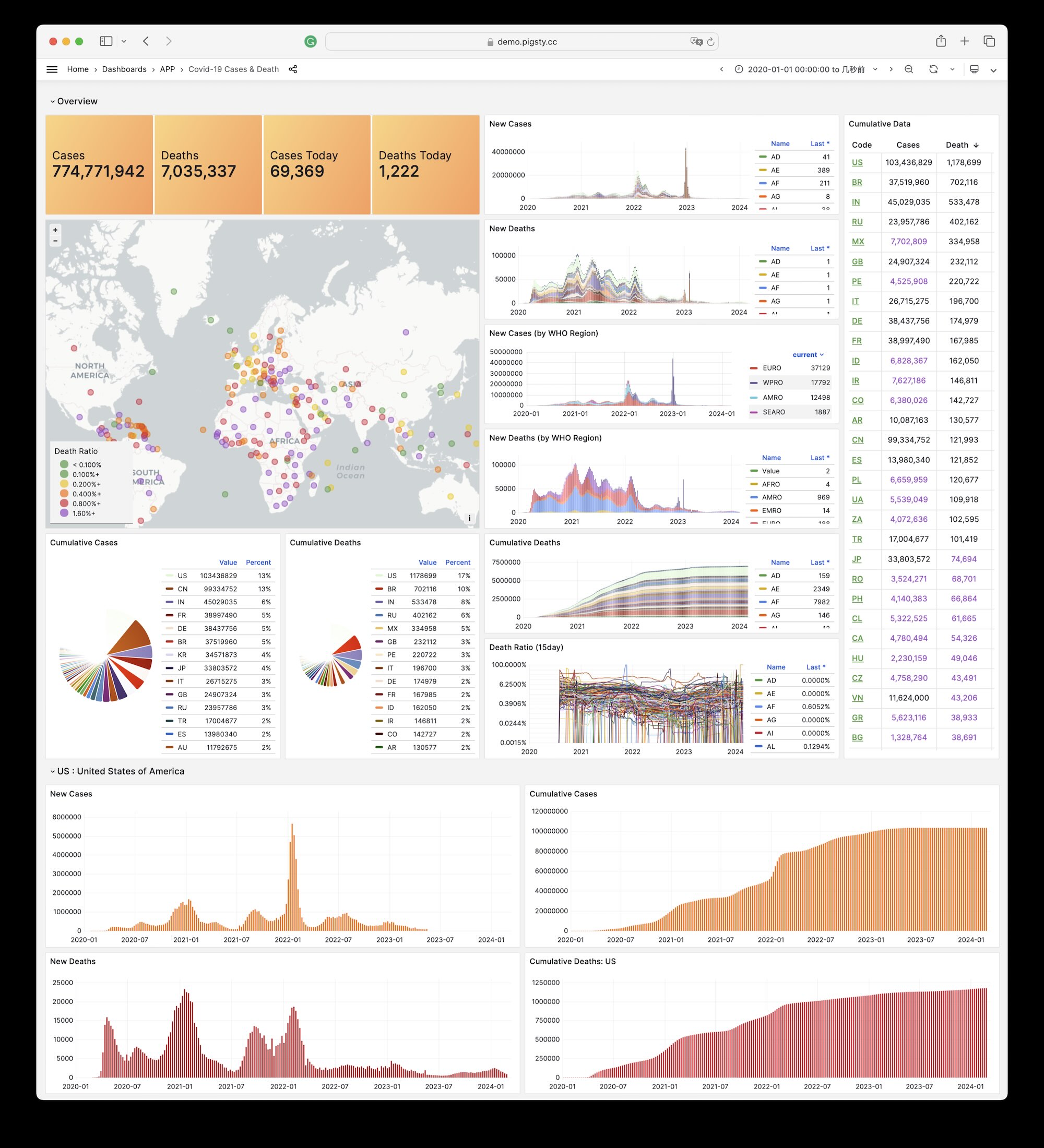 Covid is a sample Applet included with Pigsty for visualizing the World Health Organization’s official pandemic data dashboard.