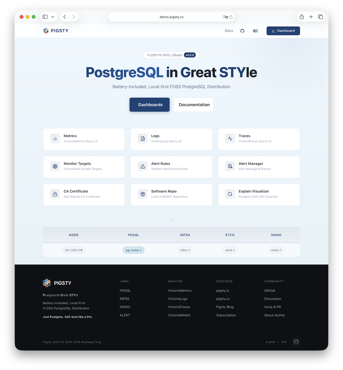 This is the Pigsty single-node install guide. For multi-node HA prod deployment, refer to the Deployment docs.